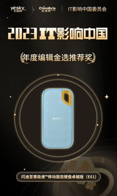 在本届”IT影响中国“年度评选中,闪迪至尊极速™移动固态硬盘卓越版凭借其出色的读写速度、坚固耐用的品质,以及安全等特性,在广受用户喜爱的同时,也成为天极网&比特网编辑部推荐的移动固态硬盘。经评审委员会与大众评委综合评定,第二十二届IT影响中国特授予闪迪至尊极速™移动固态硬盘卓越版(E61)以”年度编辑金选推荐奖“。